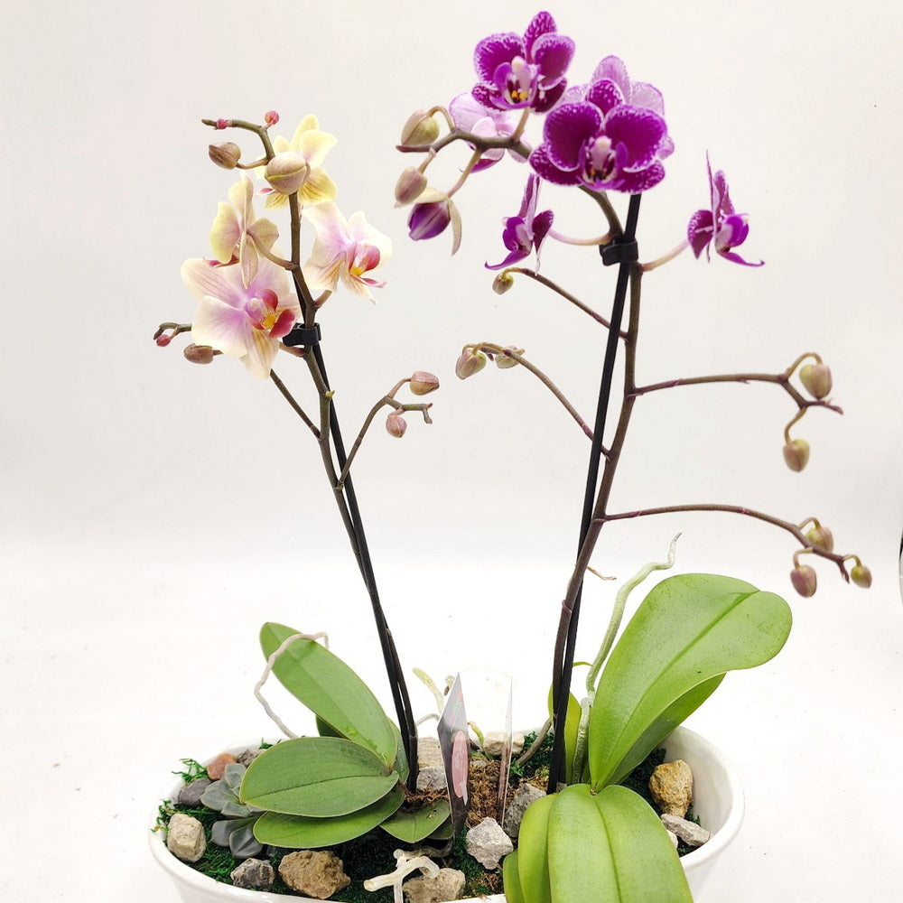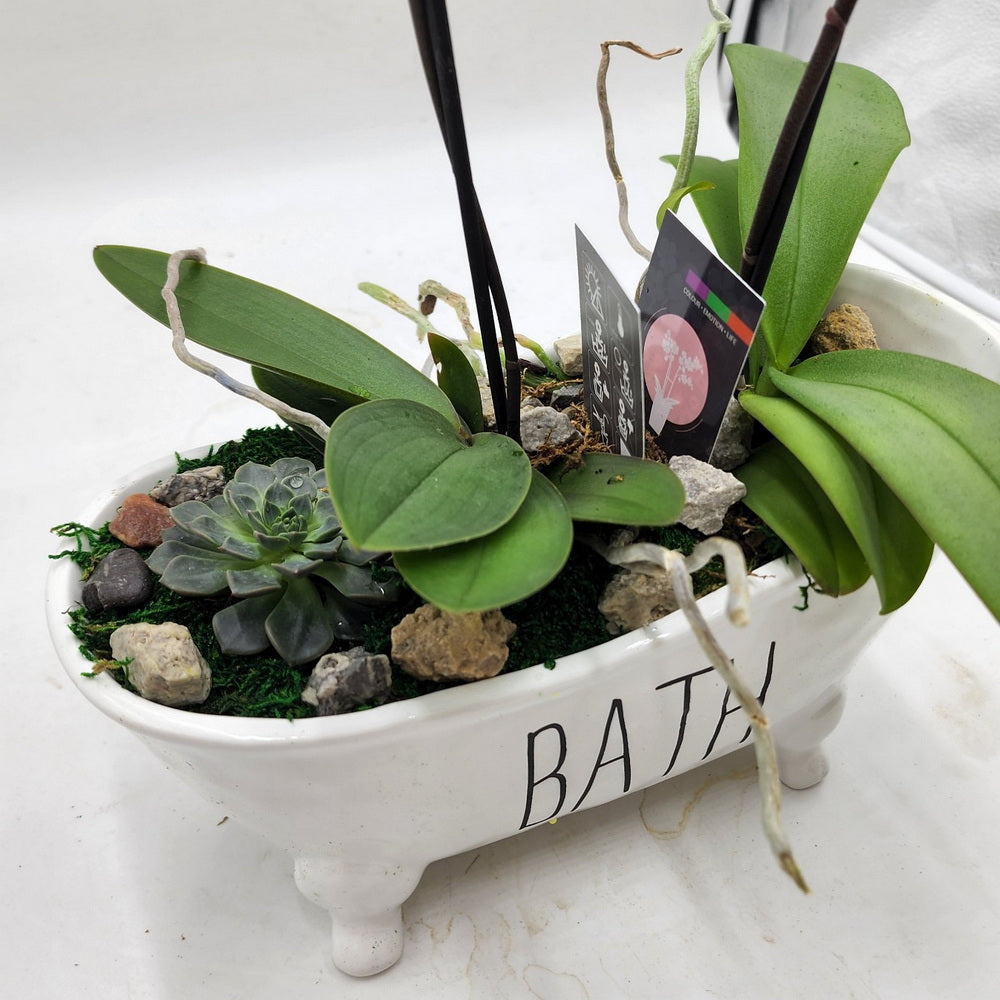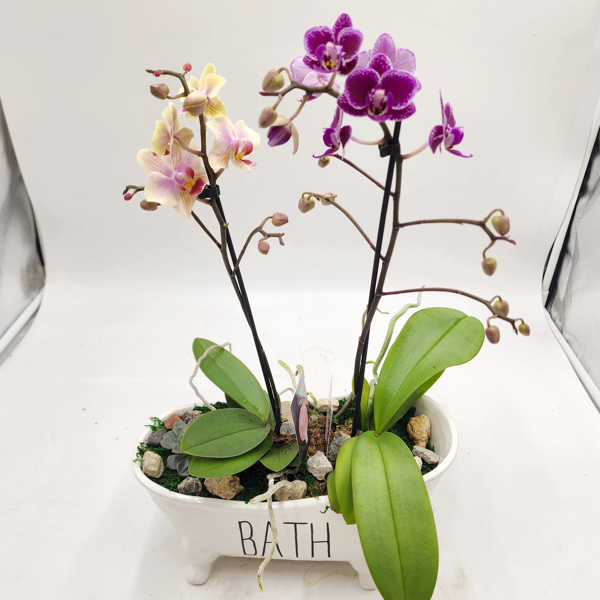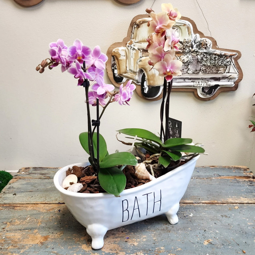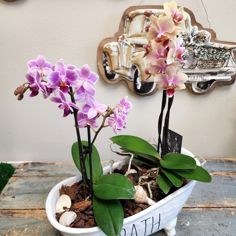 Easy to maintain and gorgeous 2 potted Orchids arranged in antique style clawfoot ceramic bathtub pot together accented with river rocks, seashells, and green moss. Great for almost any occasion and sure to please the lucky recipient.